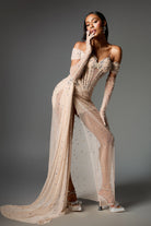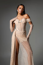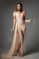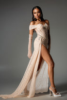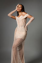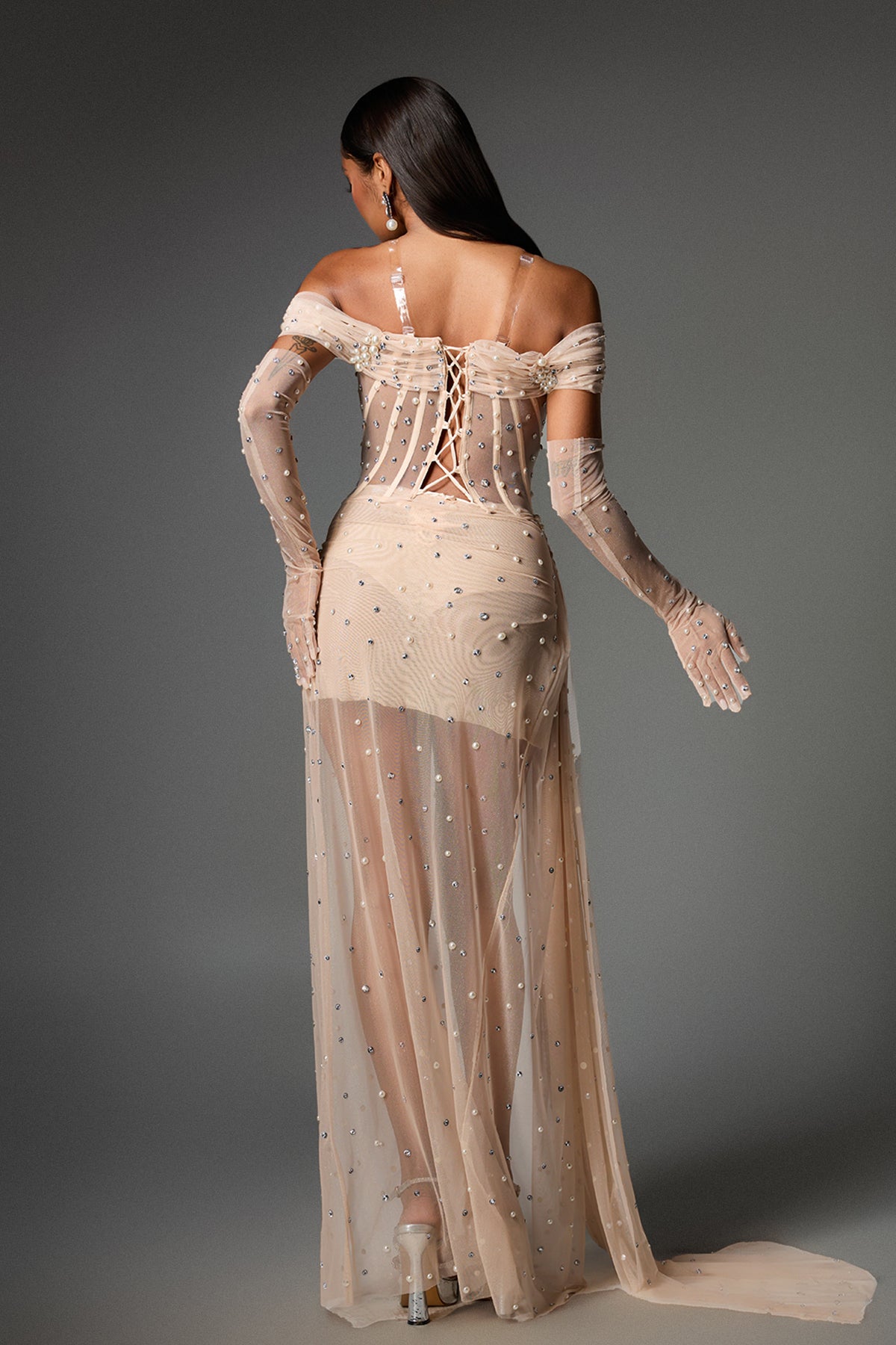 Ainsley Off Shoulder Mesh Rhinestone Dress-High-slit transparent mesh evening dress