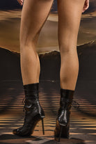 Alfonso Lace Up Ankle Boots Black are made for bold dance moves and memorable outings. Crafted from smooth black faux leather, these ankle boots have an ultra-pointy stiletto heel, pointed toe and exaggerated lace-up design for a confident look. The mid-calf height gives the silhouette an edgy and versatile look - whether you're a club queen, a catwalk star or a trendsetter, these boots will make you shine and turn heads.