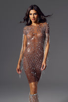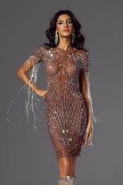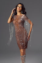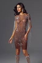 Relive Kim Kardashian's signature style with our Alice Short Sleeve Fringe Mini Dress. This stunning dress is made of premium stretch fabric and embellished with delicate crystals and rhinestones for a stunning and charming effect. The dress is decorated with flowing exaggerated fringe details, adding movement and charm to your every step. Whether it is a night date, a red carpet appearance or a high-end fashion event, this dress will make you the center of attention. Comfortable and stunning, it not only highlights your curves, but also provides flexibility to ensure that you can move freely and confidently.
