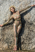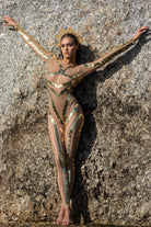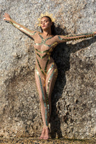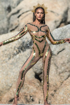 Amari Long Sleeve Sequin Jumpsuit Gold-Futuristic Mirror Geometric Bodysuit with Long Sleeves