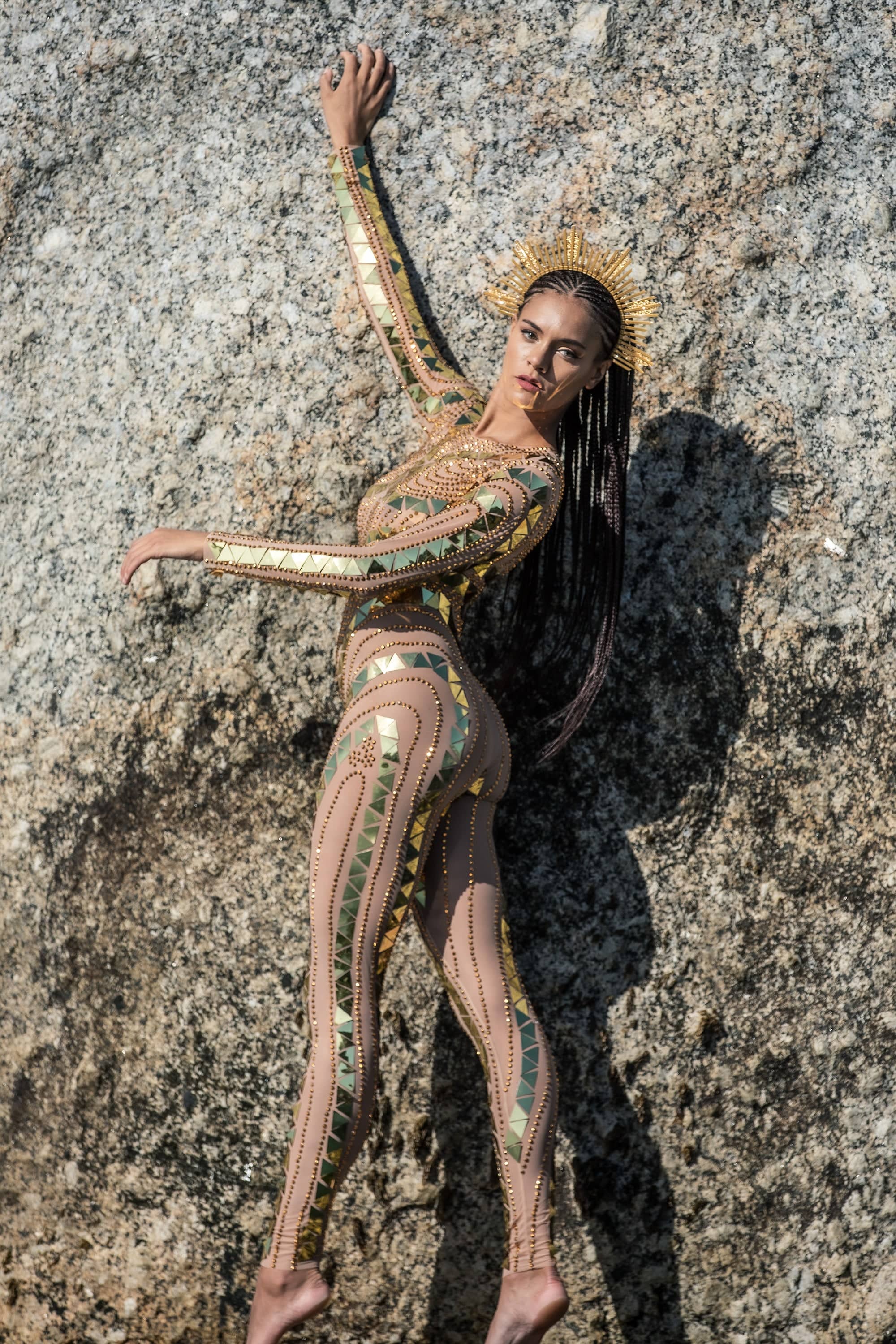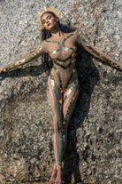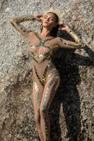 • Geometric Mirror Sequin Detailing: Intricate mirror patterns enhance the bodysuit’s futuristic appeal, making it shine from every angle.