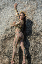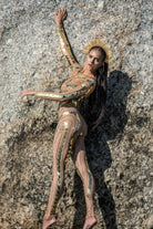 Step into the future of fashion with the Amari Long Sleeve Sequin Jumpsuit Gold. This one-piece wonder is designed to captivate attention with its bold geometric mirror embellishments and form-fitting structure meticulously adorned with hand-glued sequins and rhinestones that resemble glistening mirrors and diamonds. Featuring long sleeves and a sleek neckline, is a perfect blend of modern glam and cutting-edge style. The reflective mirror details create an eye-catching effect, making it ideal for high-fashion events, photoshoots, or daring nights out.