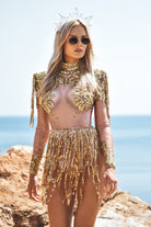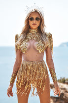 Angel Sequin Fringe Bodysuit In Gold-Stretchy Glam Performance Costume for Dance & Stage