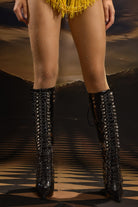 Unleash your inner idol with the Avani Leather Knee High Boots - a dramatic, high-impact shoe made for the "born this way" you are. Crafted in glossy faux leather, this boot features a slim knee-high silhouette with a waist-cinching lace-up toe cap, combining futuristic glamour with fearless attitude. A platform sole and block heel provide support and stability with every stomp, strut and pirouette. Whether you're headlining a show, pounding the dance floor, or performing pure pop performance art, this boot exudes the fearless energy of a true diva.