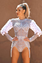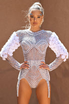 Be the center of attention in the Azariah Rhinestone Pearl Bodysuit. Perfectly blending elegance and drama, this bodysuit is made for performers and fashion-forward individuals. Featuring ruffled flowers on the sleeves and glittering bonded rhinestones and pearls, this intricately designed bodysuit creates a stunning look for stage performances, photo shoots, themed parties or avant-garde soirees.