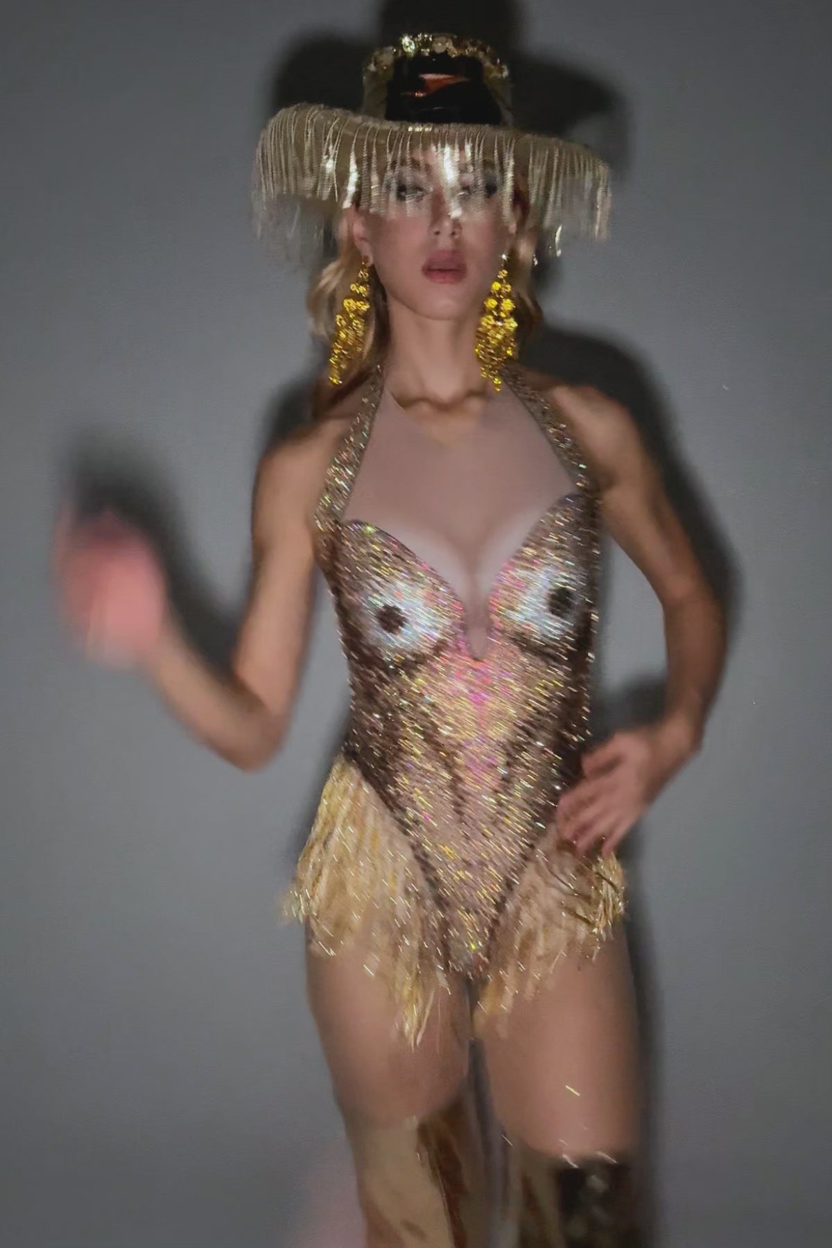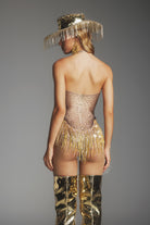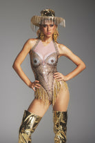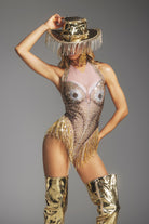 Bianca Rhinestone Fringe Bodysuit-Shine in Brown Gold Glam