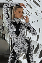 - Dramatic all-black design: Timeless black fabrication paired with a shimmering white rhinestone print creates a bold, versatile look that enhances stage appeal or elevates evening glamour.