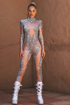 Embrace understated luxury with the Bonnie Long Sleeve Rhinestone Jumpsuit Silver a versatile skin toned marvel designed to amplify your grace on stage and beyond. Tailored for performers, bridal entertainers, and modern minimalists, this jumpsuit pairs delicate rhinestone artistry with a universally flattering nude hue, creating a seamless blend of glamour and subtlety.