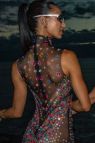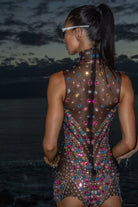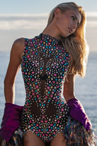 Get ready to make a statement in our Briar Mesh Rhinestone Bodysuit, a striking bodysuit that blends high-neck elegance with provocative sheer mesh allure to unleash your boldest personality. The mesh base is embellished with shimmering multi-color rhinestones, creating a glittering visual effect that enhances your natural silhouette. The high neck and sleeveless cut offer a sleek, modern aesthetic, while strategically placed rhinestones add a touch of glamour