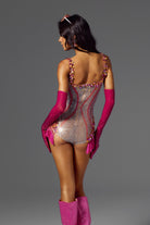 Camila Backless Rhinestone Bodysuit In Pink-A stunning rhinestone performance outfit, perfect for stage performances and special events
