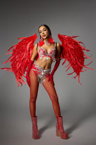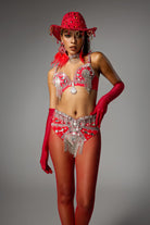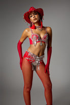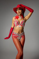 This luxurious Catalina Rhinestone Bikini Three Piece Set In Red is designed for stage performances, carnival parties, dance performances and music festivals. The whole set is made of glossy fabric, with exquisite rhinestone embellishment, reflecting charming light under the light, instantly attracting all eyes. The bikini top and high waist bottom are decorated with dazzling rhinestones and tassels, bringing dazzling dynamic beauty. The matching red necklace adds a sense of luxury to the overall look, making your look more complete. Whether you're shining on the stage or showing your personality at a party, this bikini set can help you become the focus and unleash your confidence and charm!
