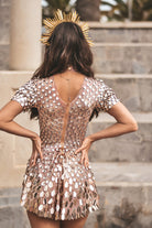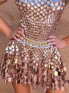 The Charlotte Sequin High Neck Dress Metallic exudes luxurious charm and is a must-have battle robe for party goddesses and music festival trendsetters. Selected high-quality metal sequins, shining brightly under the lights, the short-sleeved high-neck design is matched with exquisite tassel-feeling skirts, showing the perfect combination of elegance and fashion.