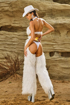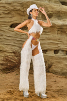 Cole Cutout Feather Pants Set, unleash pure performance energy, this set is made for the stage. The set includes a halter top with a pair of bold cutout high-waist pants, a striking belt and a dramatic hat with feathers - this set will shine. The sculptural silhouette and bold cutout design highlight every curve, while the feather details bring movement and exotic style. Whether you are performing under the lights or making a stunning appearance at a music festival, this set is made for the idol who leads the trend instead of blindly following.