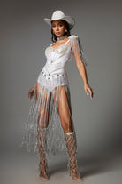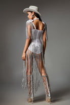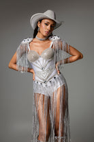Showing off the unparalleled western charm, this Dylan Fringe Embellished Bodysuit brings you a visual feast. The design incorporates exquisite silver tassels, paired with an off-the-shoulder bodysuit, giving you the ultimate sense of fashion. Every tassel detail exudes a unique glow, making it an ideal choice for parties and special occasions.