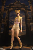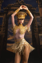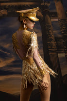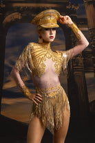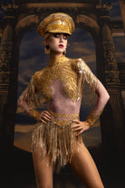 Eddie Rhinestone Fringe Bodysuit In Gold-Dazzling Diva Stage Costume