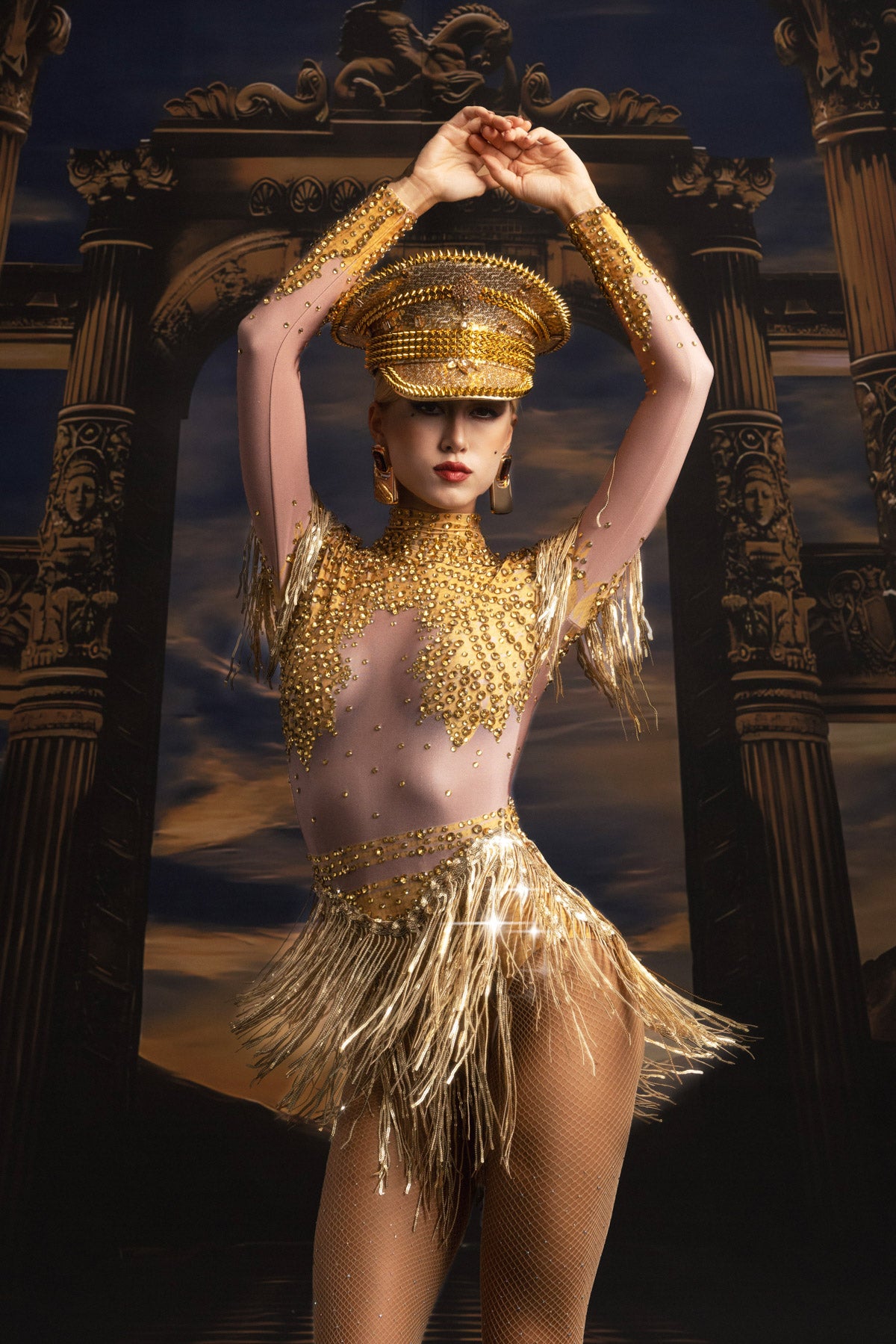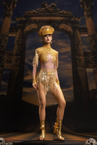 Shine like a stage goddess in the Eddie Rhinestone Fringe Bodysuit In Gold - a high-performance piece designed to light up the stage. This bodysuit is embellished with gold rhinestones and adorned with cascading fringe, so you can shine with every step, turn and strut. The slim fit accentuates your curves, while the shimmering fringe adds movement and glamour. Perfect for drag, cabaret, dance shows and music festivals, this bodysuit will make you look like a dynamic disco dancer with confidence and power.