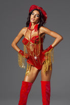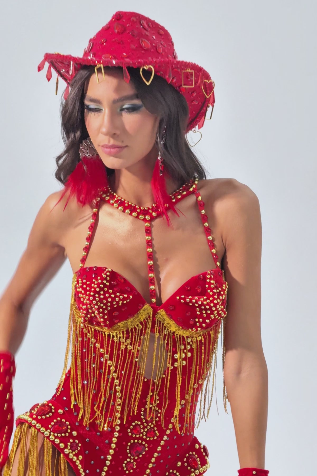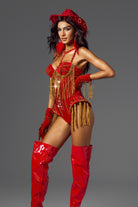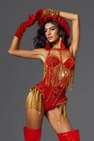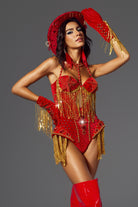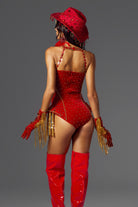 The bold red and gold color scheme, dazzling diamonds and gold draped tassel decorations, combined with retro cowboy hats and gloves, create the ultimate "Western Glam" style, which is both retro and avant-garde. The sexy halter neck design highlights the shoulder and neck lines, and the three-dimensional tailoring modifies the curves. It is a visual focus tailored for high-exposure occasions such as stage, party, MV shooting, etc.