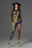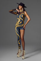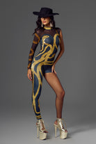 This Elie Sequin Jumpsuit In Gold is inspired by the stage style of pop queen Taylor Swift, with strong gold and sexy black as the main colors, presenting a bold and flamboyant visual impact. The gold snake sequins wrapped around the body seem to pass through the skin like lightning, combined with a single sleeve design on one side and a transparent mesh element, instantly increasing the sexiness index. The right leg exposed design is bold and novel, perfectly lengthening the leg line. Suitable for high-profile occasions such as dinners, parties, performances or photo shoots.