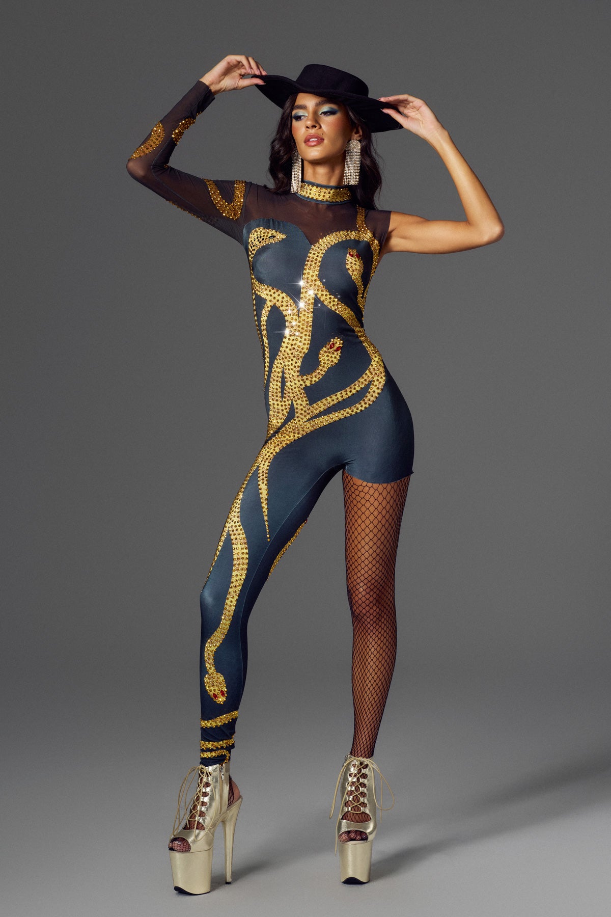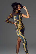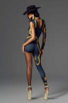 - Sequin embellishment design: gold sequins snake winding around, very futuristic and stage sense.