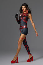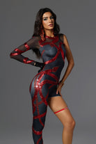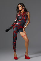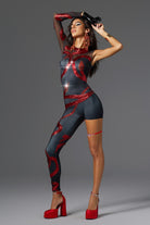 This Elie Sequin Jumpsuit In Red is inspired by the stage style of pop queen Taylor Swift, with strong red and sexy black as the main colors, presenting a bold and flamboyant visual impact. The red snake sequins wrapped around the body seem to pass through the skin like lightning, combined with a single sleeve design on one side and a transparent mesh element, instantly increasing the sexiness index. The right leg exposed design is bold and novel, perfectly lengthening the leg line. Suitable for high-profile occasions such as dinners, parties, performances or photo shoots.