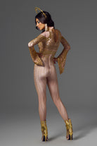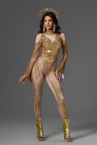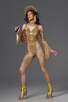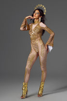 Inspired by Beyoncé's classic stage style, this Eloise High Neck Rhinestone Jumpsuit perfectly combines luxury and sexiness. Exquisite rhinestone decoration extends from the neckline to the legs, creating an elegant and unique visual effect. The streamlined design with bold gold decoration adds a modern and dynamic feel to the overall look. The cuff design makes every movement full of drama, making the wearer the focus on the stage or any important occasion. Whether it is a stage performance, a fashion party or a red carpet event, this jumpsuit can perfectly show your confident and charming side.