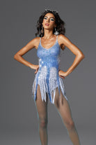 Emilia Spaghetti Fringe Rhinestone Bodysuit-Shimmering Blue Crystal Bodysuit with Flirty Fringe Details