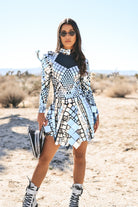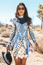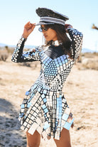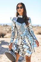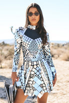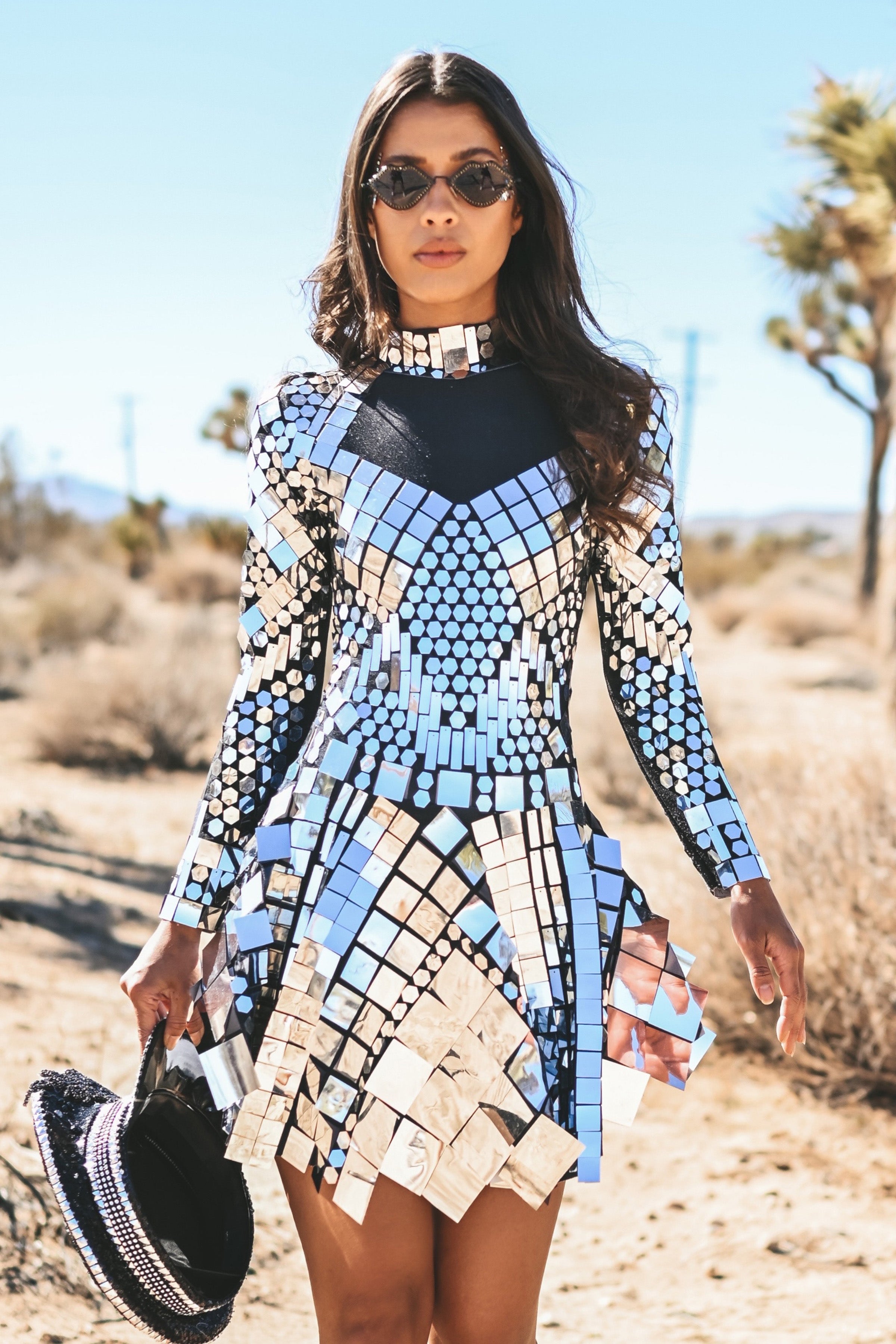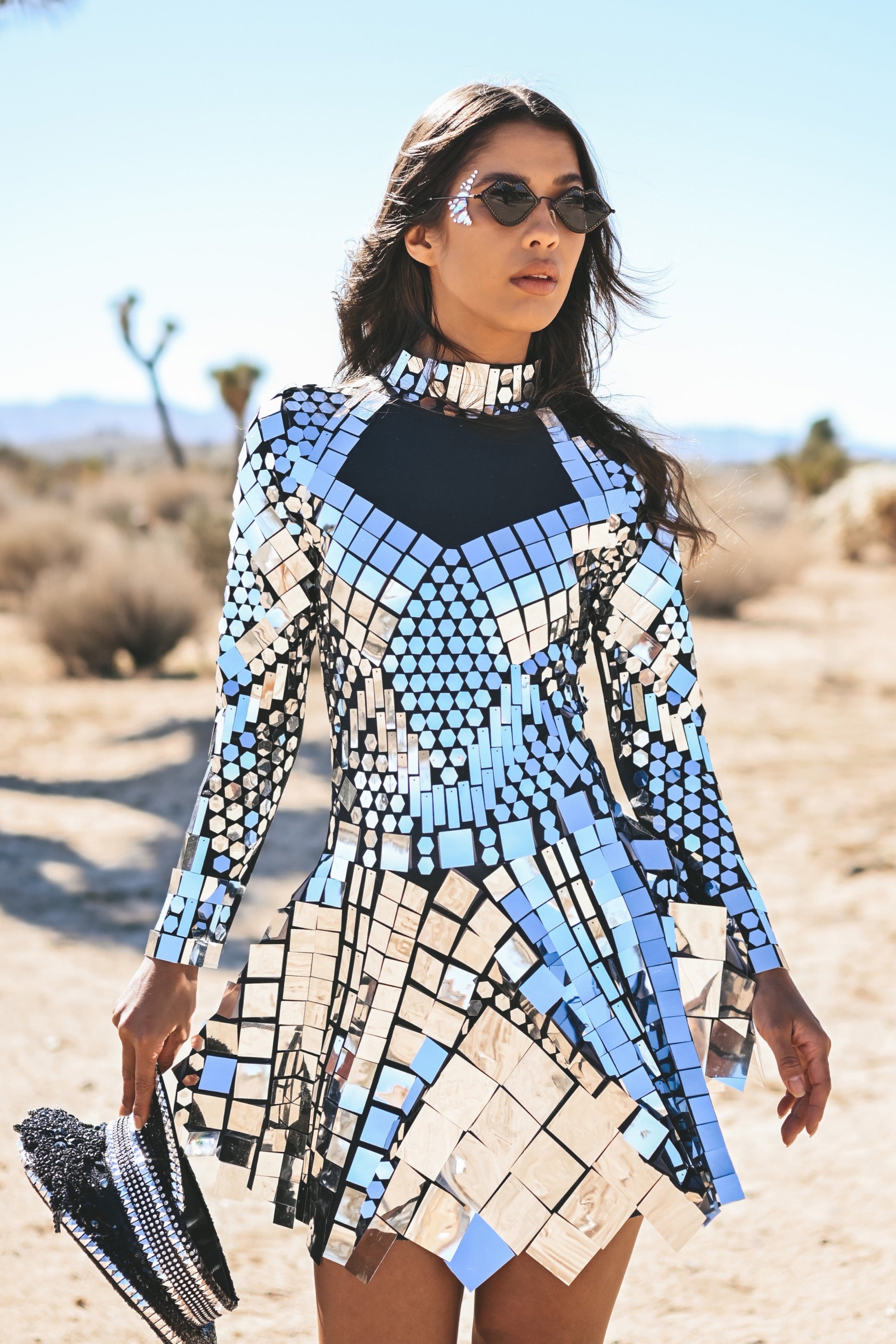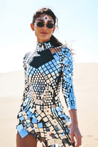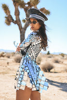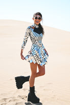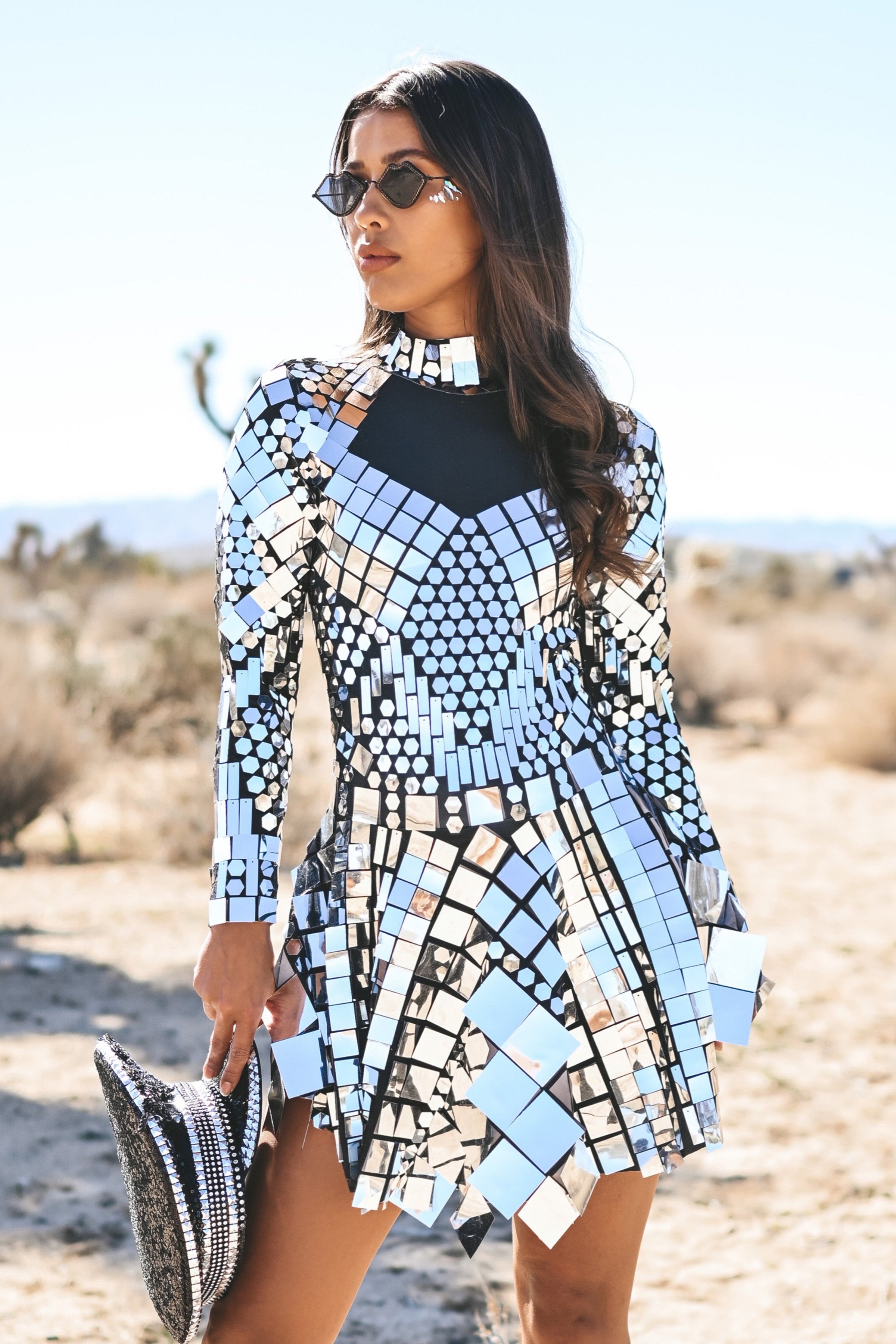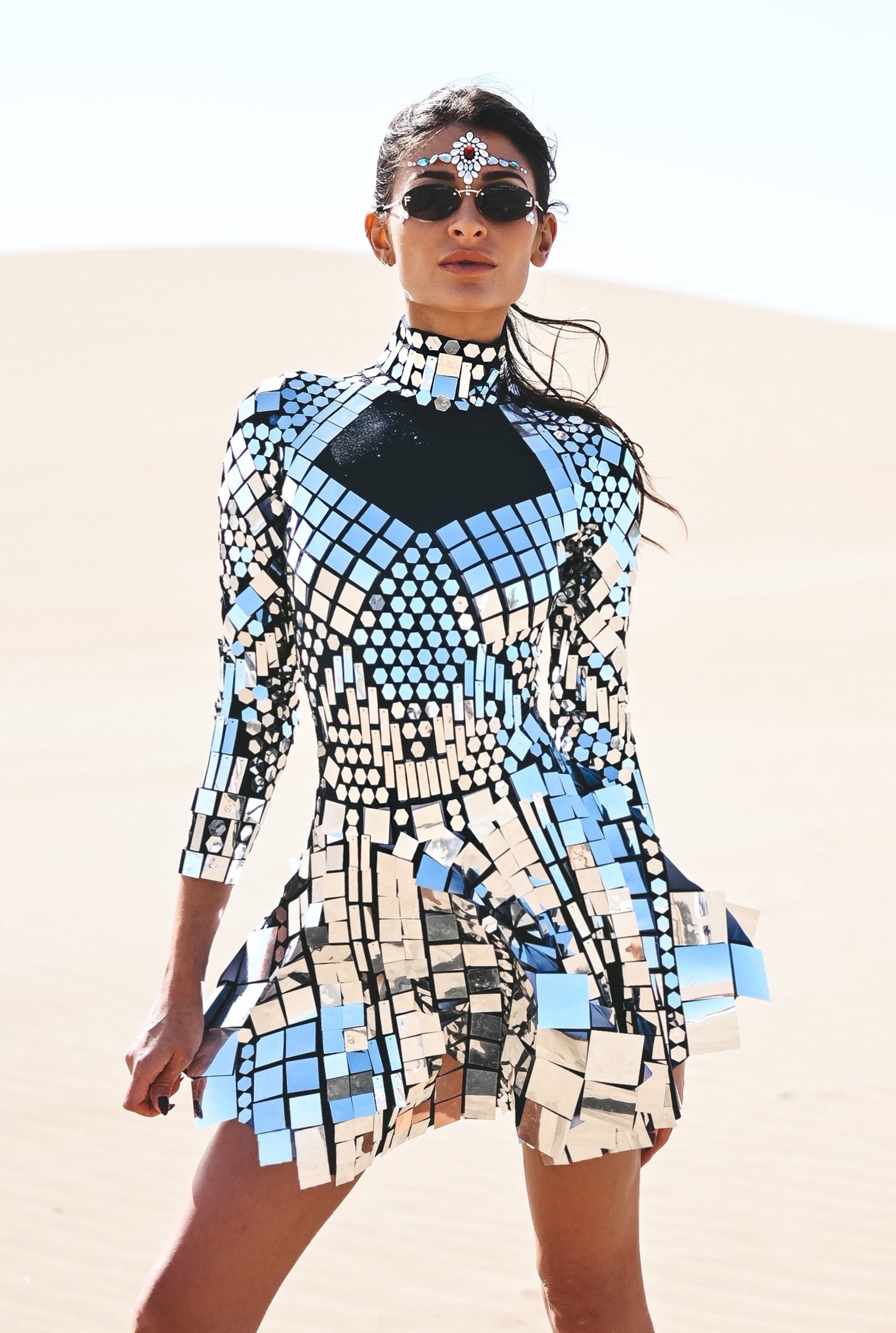 This Emma Mirror Sequin Dress Black is a unique fashion item, perfectly combining modern gloss and bold design. Made of mirror reflective material, the delicate stitching of the skirt shines in the sun, giving you a dazzling effect like the starry sky. Whether it is a party, fashion event or any important occasion, this dress can make you the focus. Its exquisite black high collar and tailoring design perfectly show the combination of elegance and avant-garde.