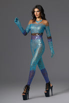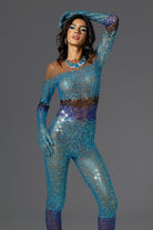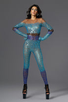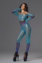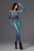 Shine like a star in the Hannah Long Sleeve Rhinestone Jumpsuit, a stunning piece inspired by the legendary Anok Yai. This full-body jumpsuit is made from sheer mesh and embellished with sparkling rhinestones in a stunning blue-purple gradient effect. The fluid silhouette hugs your curves while offering flexibility and comfort, making it perfect for dancers, performers, or anyone who craves to be the center of attention. Whether you're hitting the stage, attending a music festival, or making a stunning appearance at a high-fashion event, this jumpsuit is your ultimate tool for glamour.