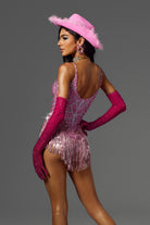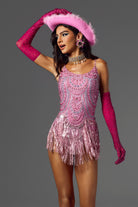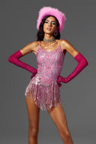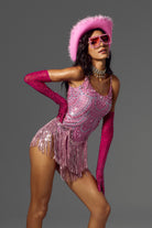 Harper Spaghetti Fringe Bodysuit Pink-Glittering Backless Fringe Bodysuit for Concerts & Performances