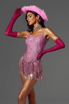Unleash your inner Taylor Swift and shine in the spotlight with this eye-catching Harper Spaghetti Fringe Bodysuit Pink! Featuring a sexy open back silhouette, delicate sparkling rhinestone embellishments and playful, flowing fringe details, this bodysuit is a must-have for performers, concert-goers and costume lovers.