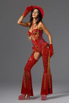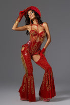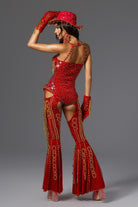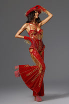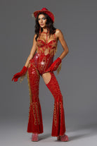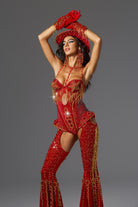 Release your stage queen energy, this Ivy Halter Neck Rhinestone Festival Outfit in the same style as Beyoncé is a styling tool tailored for you who are destined to be the focus. The whole jumpsuit is mainly in high-saturation red, supplemented by gold beaded embroidery and rhinestone decoration, creating the ultimate luxury and power, perfectly paying tribute to Beyoncé's tour style.