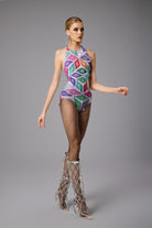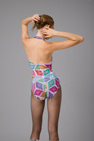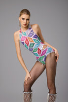The James Sleeveless Mesh Rhinestone Fringe Bodysuit perfectly blends boldness and glamour. This bodysuit features intricate rhinestone detailing and elegant fringe, while the mesh backing adds an edgy, modern feel. The colorful design creates a striking visual effect, ensuring your every move is dazzling. Whether you're rocking the dance floor, attending a special event, or performing on stage, this bodysuit will surely make you the center of attention.
