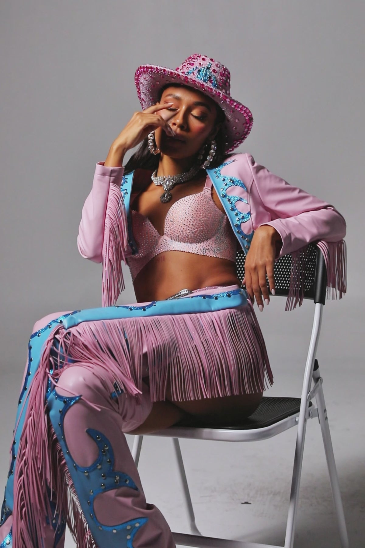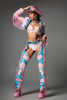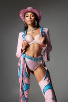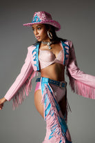 Designed for the fashion-forward woman, embrace bold, daring style with the vibrant Jaylani Fringe Cowgirl Outfit In Pink. Combining playful pink and blue hues with eye-catching fringe details, this set adds a modern twist to classic western fashion. The set includes a long jacket with fringe and fringe cut-out pants, perfectly blending glam and cowboy chic. The included matching cowboy hat adds the finishing touch to your stylish look.