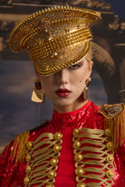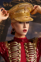 Show off your authority with the Jianna Rhinestone Embellished Navy Hat Gold - a stunning piece of headwear designed to command the spotlight. With a structured navy silhouette and embellished with gold rhinestones, this hat combines military-inspired authority with sparkling glamour. Perfect for drag queens, cabaret stars, concert performers and festival icons, it elevates the boldness of any look and makes it more legendary. Whether you're a king on the catwalk or a dancer on the dance floor, this hat is the ultimate crown for the born performer.