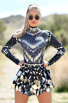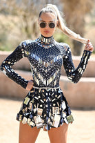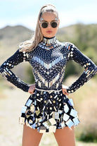 Command attention in this Josie High Neck Sequin Dress Black, designed to make you shine at any event. Featuring a sleek high-neck, long sleeves, and an intricate arrangement of reflective mirror embellishments and rhinestones, this dress is the ultimate festival, clubwear, and party essential. The contrast of black fabric with shimmering mirror details creates a bold, futuristic look perfect for raves, performances, and high-fashion nights out.