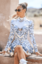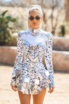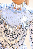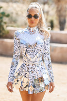 Shine like a star in this Josie High Neck Sequin Dress White! Featuring a high-neck, long sleeves, and a stunning mix of reflective mirror embellishments and rhinestones, this dress is perfect for festivals, nightclubs, parties, and special events. The fitted bodice and flared skirt create a flattering silhouette, while the bold metallic design ensures all eyes are on you.