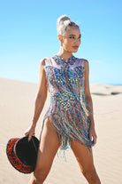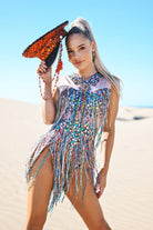 This Kora Sleeveless Rhinestone Fringe Bodysuit is a carnival of light and color! It is made of hand-bonded colorful rhinestones and paired with smart tassels, releasing rainbow-like light with every turn. The elastic fabric fits the body perfectly, and the tassels swing naturally with the movement. Whether it is a drag show, jazz dance, music festival or theme party, you will be the irreplaceable focus!