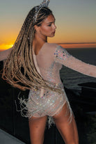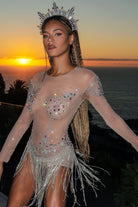 A bold blend of sexiness and sparkle, the Kyla Mesh Rhinestone Fringe Bodysuit is crafted for unforgettable stage moments, cabaret performances or high fashion events to unleash your inner performer. Made from beige sheer mesh fabric, our beautiful bodysuit is embellished with hand-bonded sparkling rhinestone details and a hip-defining rhinestone fringe belt, exuding glamour and designed to mesmerize in the spotlight.
