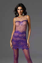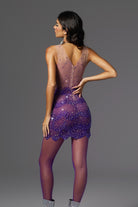 Unleash your inner pop princess in the Lainey Sleeveless Mesh Rhinestone Mini Dress. This dazzling dress is inspired by Sabrina Carpenter's iconic glam style. Encrusted with shimmering purple rhinestones, this sheer mesh mini dress catches the light from every angle for a mesmerizing sparkle. The fitted silhouette accentuates your curves, while the scalloped hem adds a hint of playful femininity. Whether you're hitting a music festival, the dance floor, or making a grand entrance at a party, this stunning dress will turn heads.