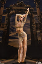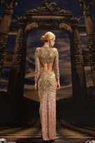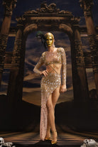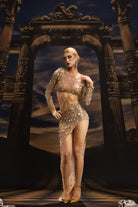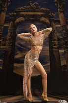 Shine on stage in the Langston Split Rhinestone Maxi Dress. This floor-length maxi dress features a bold front slit for added sparkle and structure. Encrusted with rhinestones from shoulder to hem, this gown is sure to turn heads and be the center of attention. The sheer long sleeves add an elegant edge, while the fitted silhouette flatters your figure with every step. Whether it's a stage show, drag night, gala or red carpet, this dress exudes pure star power.