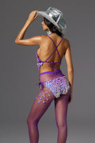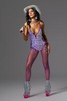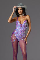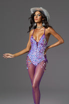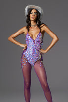 Be the center of attention in our Leah Halter Neck Sequin Chain Bodysuit, designed for the bold and fearless fashionista. This dazzling bodysuit is embellished with shimmering purple sequins that catch every ray of light, ensuring you'll always be the center of attention. Adjustable side ties and dangling gold chain details add a touch of edgy glamour, while the plunging neckline and open back are ultra-glamorous. Perfect for music festivals, dance performances or unforgettable party nights, this bodysuit will let you create a dazzling look that will make you shine.