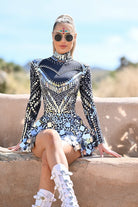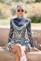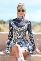 Lia Rhinestone Sequin Mini Dress Black-Long sleeved high collar slim party dress
