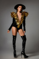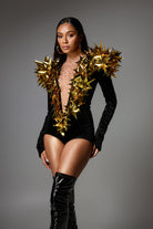 This Lina Long Sleeve Star Sequin Bodysuit is the perfect choice for parties and dinners. The unique design of the golden star-shaped ornaments combined with the deep V-neckline of the mesh the long sleeves provide extra coverage while the bodysuit design ensures a sleek and flattering fit,show a bold and avant-garde fashion style. Whether it is a fashion party, a nightclub or a special occasion, this jumpsuit can make you the focus and show your personality and charm.