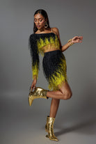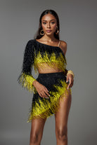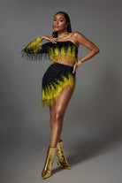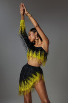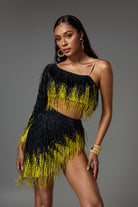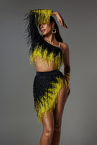 Designed for performers who love bold, geometric shapes, the lvanna One Shoulder Fringe Skirt Set combines a daring one-shoulder crop top with a flowing rhinestone fringe skirt in yellow and black fabric. The stretch fabric amplifies every body twirl during Latin dance, burlesque or music festival choreography.