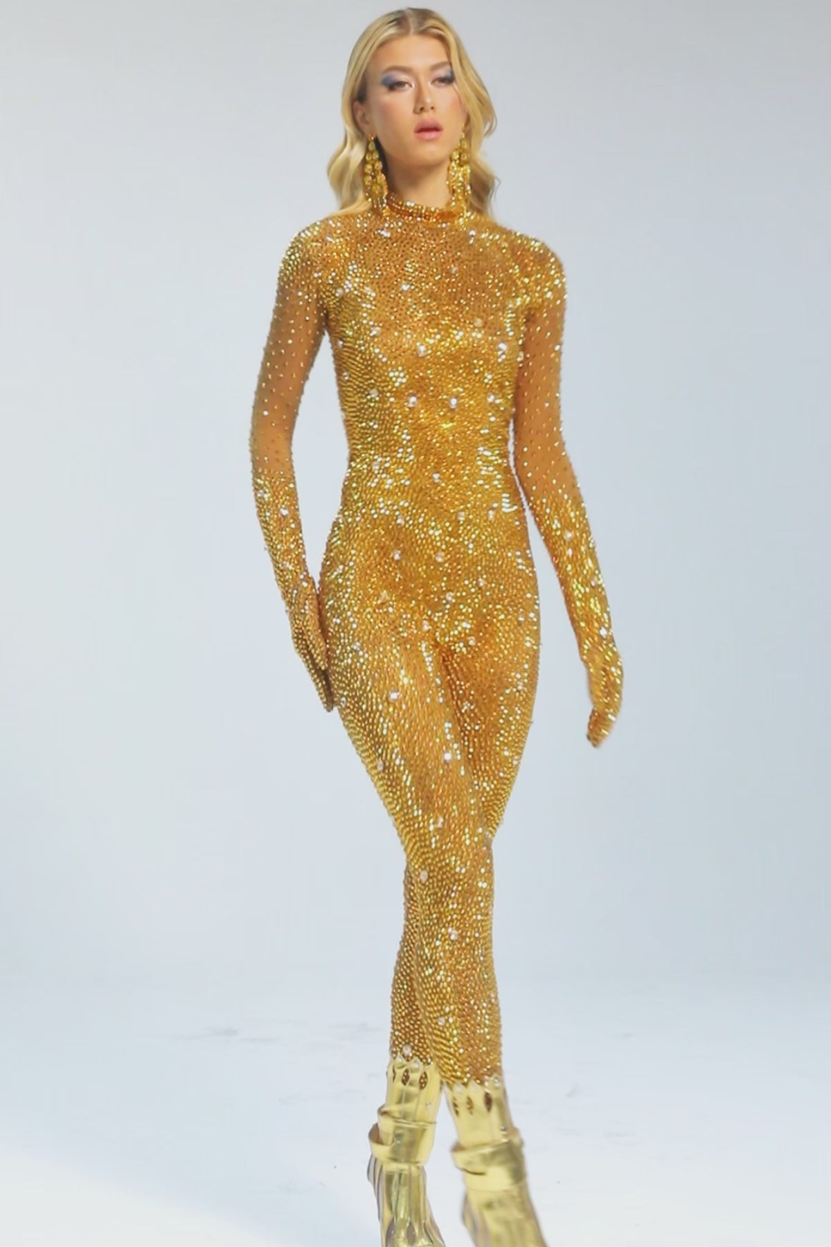 Maisie Rhinestone Gloves Jumpsuit Gold