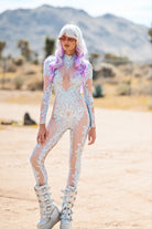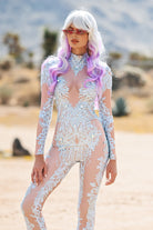 Makenzie Long Sleeve Rhinestone Jumpsuit White-Stretchy Long Sleeve Stage Costume