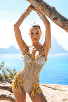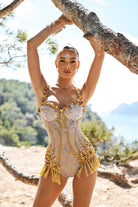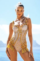 Shine like a goddess with our Maren Spaghetti Rhinestone Sequin Bodysuit Gold, glamorous getaways. Handcrafted with exquisite rhinestones, fringe, and shimmering sqeuin, this bodysuit offers a perfect blend of elegance and bold fashion. The form-fitting bodice accentuates your curves, while the gold tassel embellishments add a touch of bohemian flair. Made with high-quality stretch fabric for a comfortable yet secure fit, this statement bodysuit is perfect for photoshoots, music festivals and special occasions.