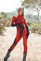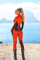 This jumpsuit features long sleeves, long black gloves and a zip fastening at the back.