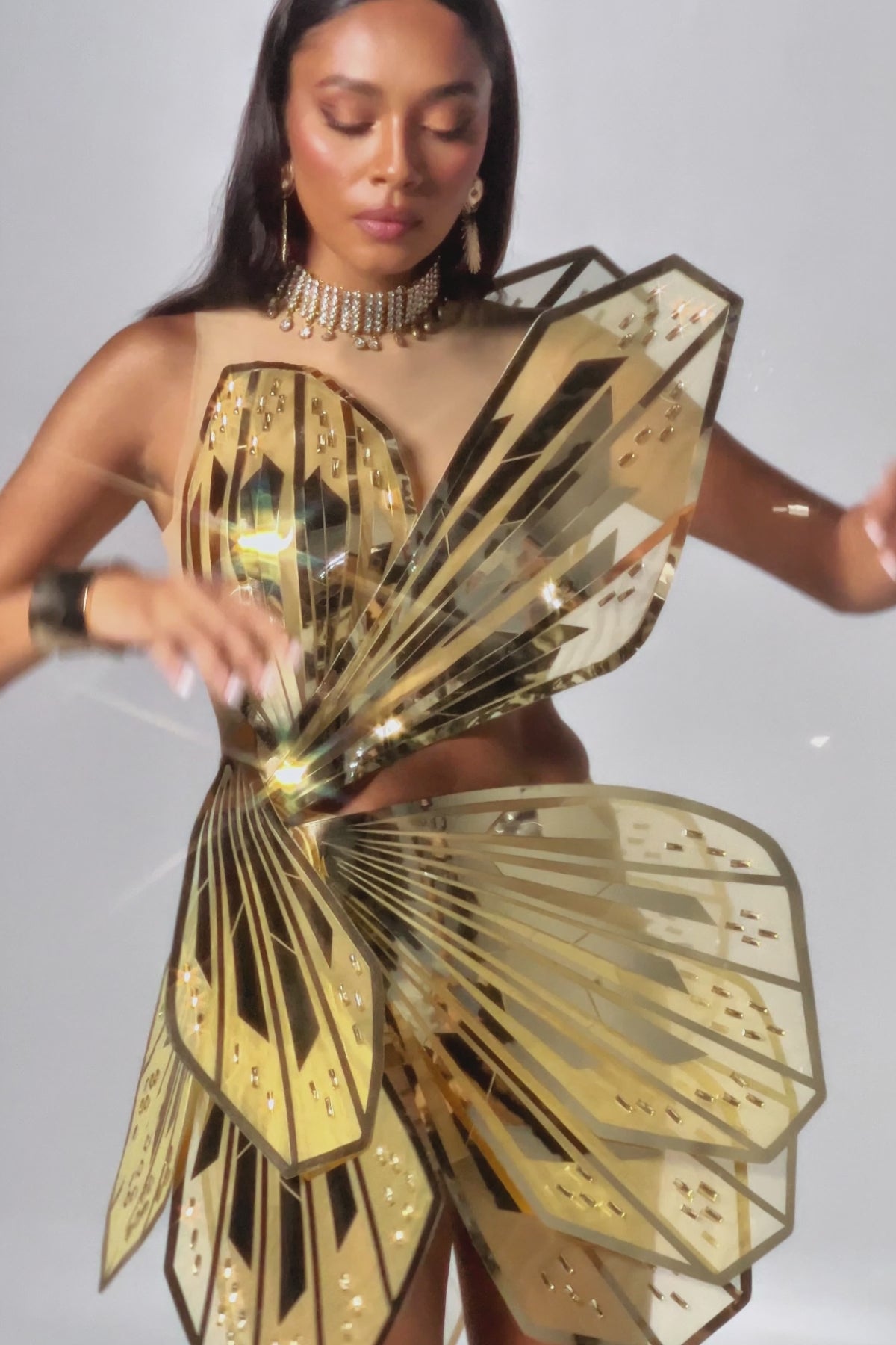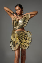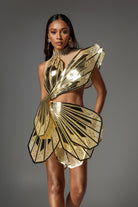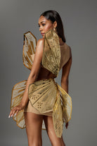 Elevate your style and turn heads at any event with this Mavis Sequin Butterfly Cutout Dress. The unique butterfly design is enhanced with sequin details that reflect light, creating a shimmering effect from every angle. The asymmetrical cut paired with a sharp geometric pattern creates a bold, futuristic look, while the soft nude fabric provides a striking contrast. This eye-catching dress is perfect for a glamorous evening out