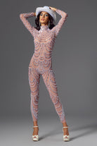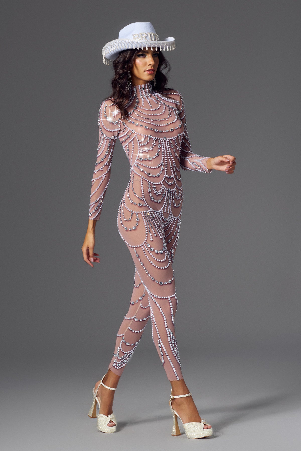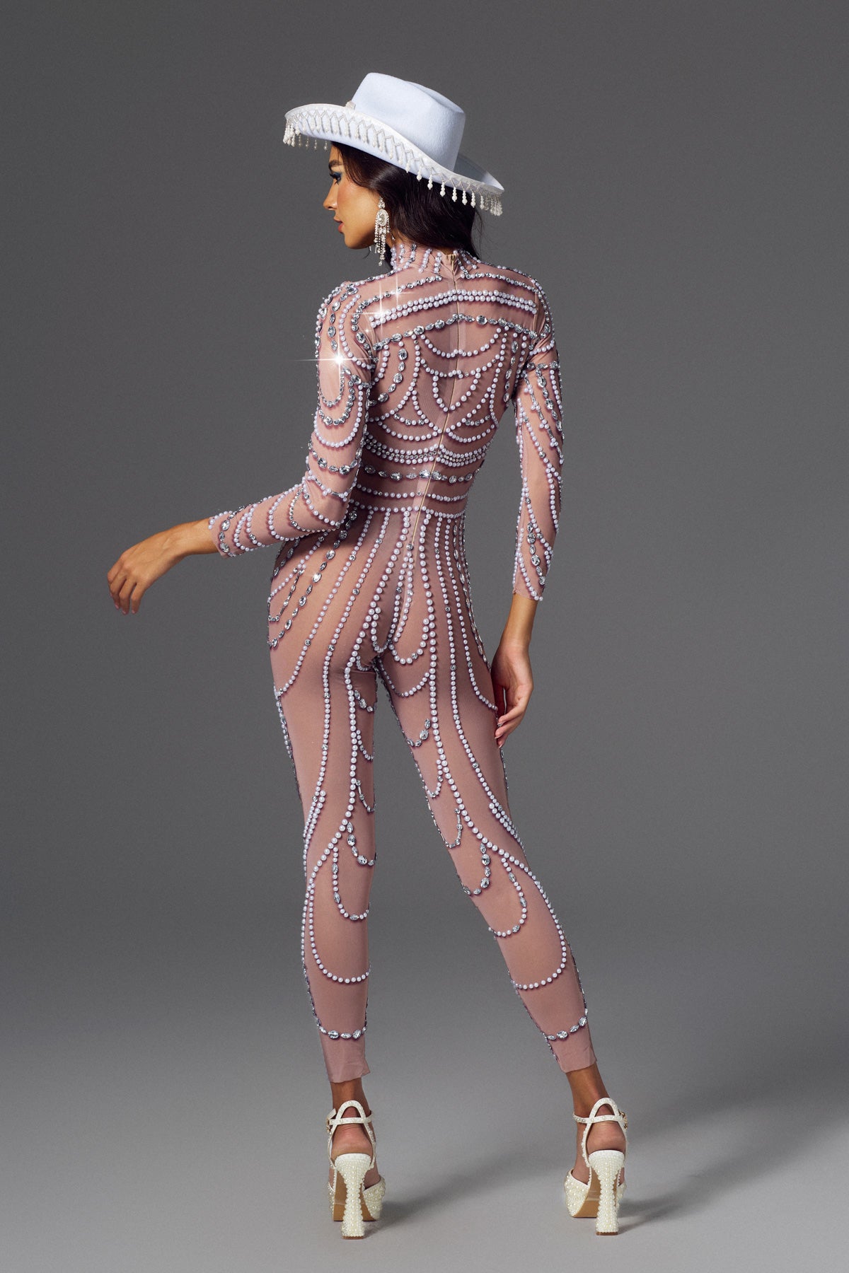 Make the spotlight like Taylor Swift in our Natalie Long Sleeve Pearl Jumpsuit, designed for those who love to sparkle. This sheer mesh jumpsuit is embellished with hundreds of dazzling rhinestones and pearls in a stunning geometric pattern. The delicate crystal/rhinestone and pearl embellishments create a mesmerizing effect, catching the light from every angle, while the fitted silhouette shapes and flatters your figure. Perfect for performances, red carpet events, or anytime you want to shine, this jumpsuit will exude celebrity-like elegance in every move.